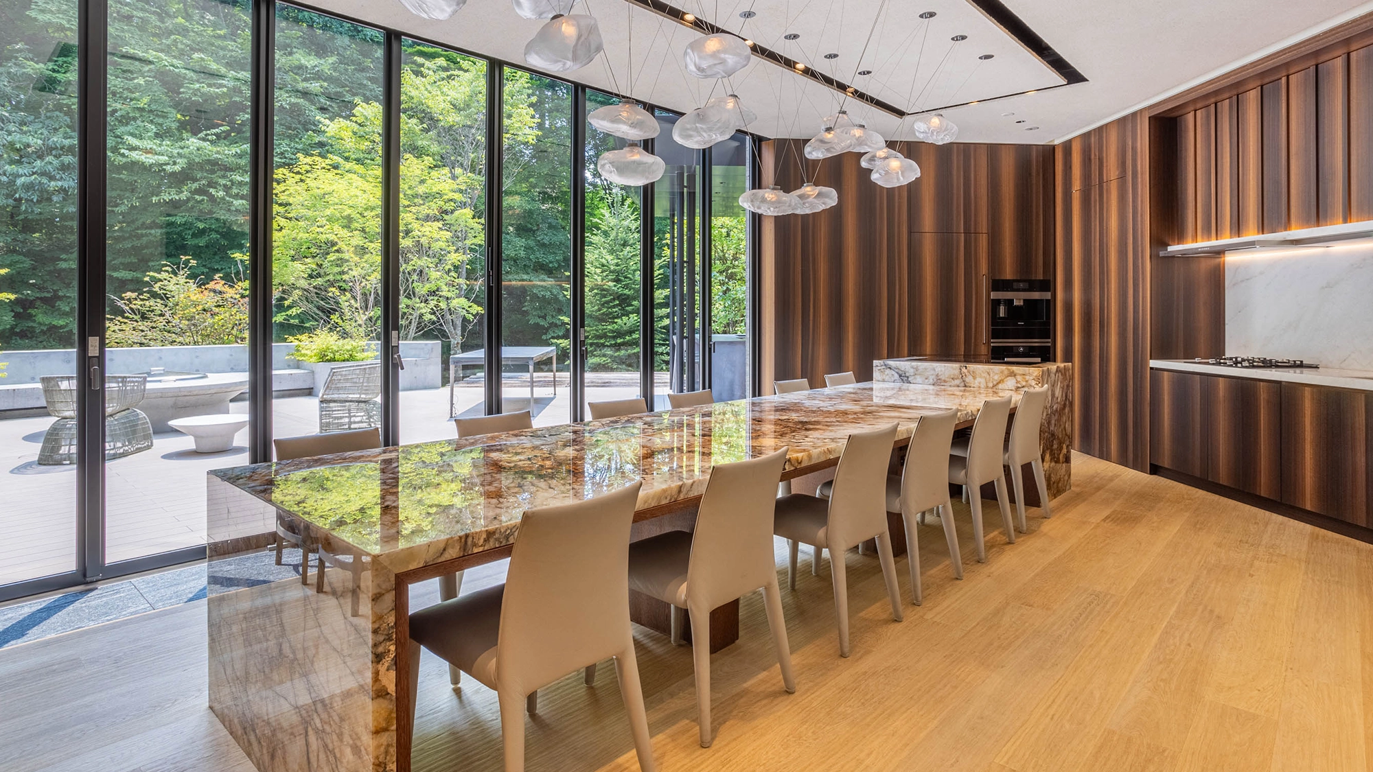 美しい翡翠石のダイニングテーブルと最先端のキッチン機器を備え、