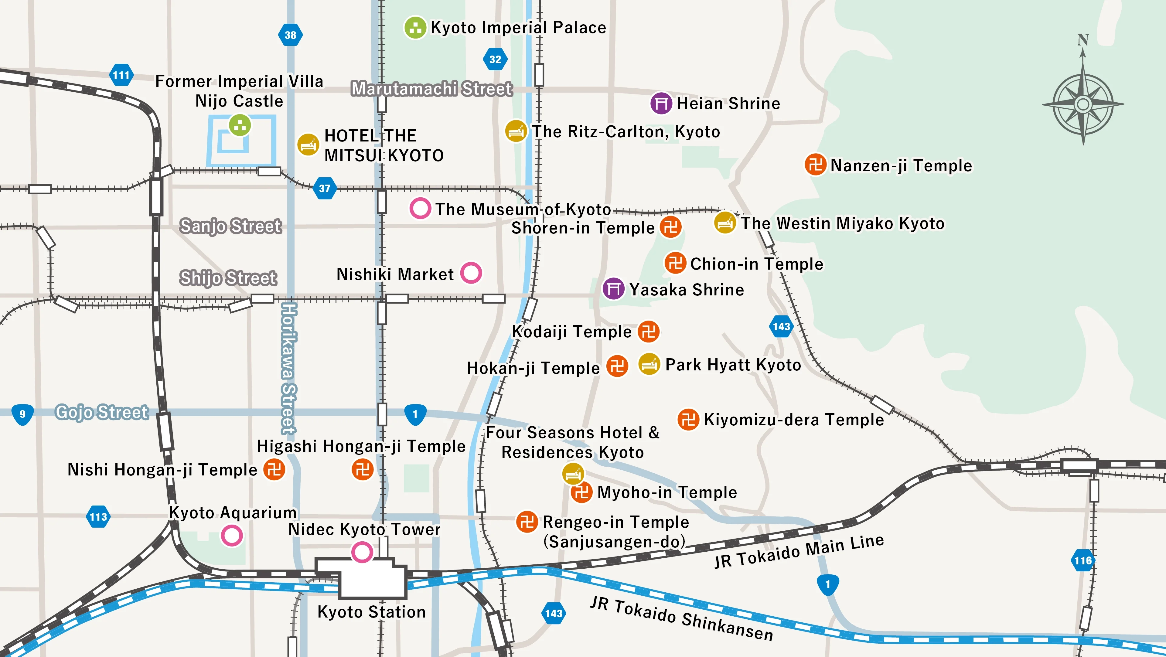 Near Nijo Castle, HOTEL THE MITSUI KYOTO presents a refined unity of garden and architecture. Built on the former Mitsui family estate, guest rooms and restaurants are arranged around a central courtyard, allowing visitors to savor Kyoto’s seasons entirely within the hotel.